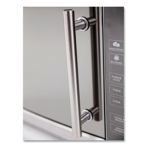 Sleek mirror finish design with an electronic control panel. Ease of operation with One Touch cooking programs, speed defrost, cook/defrost by weight, and a digital cooking timer. 1,000 watts of cooking power, kitchen timer and removable glass turntable make this microwave an excellent choice. Interior Volume Capacity: 1.1 cu ft; Turntable Diameter: 12.5"; Color(s): Stainless Steel; Width: 21.25".