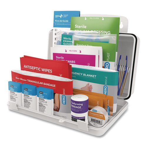 | Contains: | AeroBand Triangular Bandage 43" x 43" x 61"; AeroBurn Burn Gel Packets; AeroForm Conforming Gauze Bandage 2" x 4.3 yd; AeroGlove Nitrile Gloves; AeroGuide First Aid Guide; AeroInstrument Tweezers; AeroKit 10 Series Case; AeroPad Gauze Pad 3" |