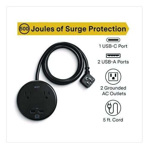 Experience seamless power and connectivity with this mini conference room surge protector. This NXT Technologies compact powerhouse features two outlets, two USB Type-A ports with 2.4 A charging capacity, and one USB Type-C port with 15 W charging capability. Stay plugged in and charged up as you connect and collaborate effortlessly. With its sleek design and versatile functionality, this surge protector is a must-have for productive meetings and efficient device management. Number of Outlets: 2 AC; 3 USB; Joules Of Surge Protection: 500 J; Jacks/Ports: USB; Protection Type: Surge.
