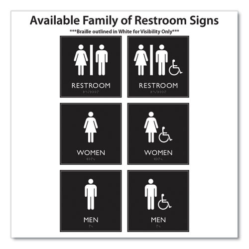 Universally and easily recognizable white graphics. Raised tactile graphics with grade 2 braille. Meets Americans with Disabilities Act (ADA) requirements. Includes double-side adhesive tape for mounting to door or wall.