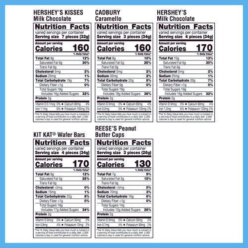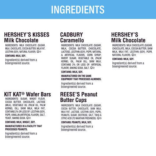| Flavor: | Cadbury Caramello Milk Chocolate Caramel; Hershey®'s Milk Chocolate; Hershey®'s Milk Chocolate KISSES; Kit Kat®; Reese's® Peanut Butter Cups |