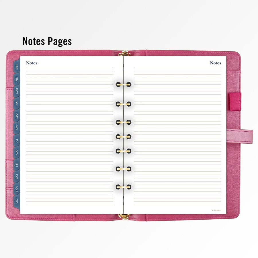 Undated starter set features luxurious and fashionable, faux-leather covers with an exterior zipper pocket and a buckle closure. To set up your planning any time, take advantage of the set that includes an undated 12-month tab set, 16 undated weekly pages and 24 notes pages. Two-page-per-week spreads offer ruled planning space with hourly appointment times from 8 AM to 5 PM. Two-page-per-month spreads have open daily blocks with a shaded area to write in the date plus space at the top to write in the month and year. Each month is tabbed, and future year reference calendars are displayed. Organizing pockets inside the cover provide additional storage. Cover also comes with an elastic pen loop. Starter set accessories include a zippered pouch, page marker ruler and 24-sheet notepad. Organizer cover is binder style with seven rings (3/4") so pages stay secure. Desk size starter set (size 4) comes with 5-1/2" x 8-1/2" pages.