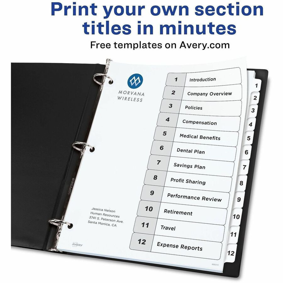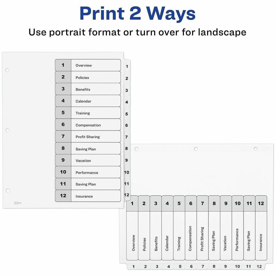 Create great-looking documents with black and white style dividers and quickly make multiple copies. Coordinated divider system includes a reinforced Table of Contents page, matching preprinted tab dividers labeled, added tab reinforcement, double-sided hole reinforcement on tabbed dividers and paper made of heavy stock. 2-in-1 tab design lets you pick between portrait and landscape formats. Simply print the section titles onto the Table of Contents page using your inkjet or laser printer. Tab dividers are also compatible with typewriters and copiers. Dividers are three-hole punched for use in binders. Avery offers many easy-to-use templates for Microsoft Word and other popular software programs.