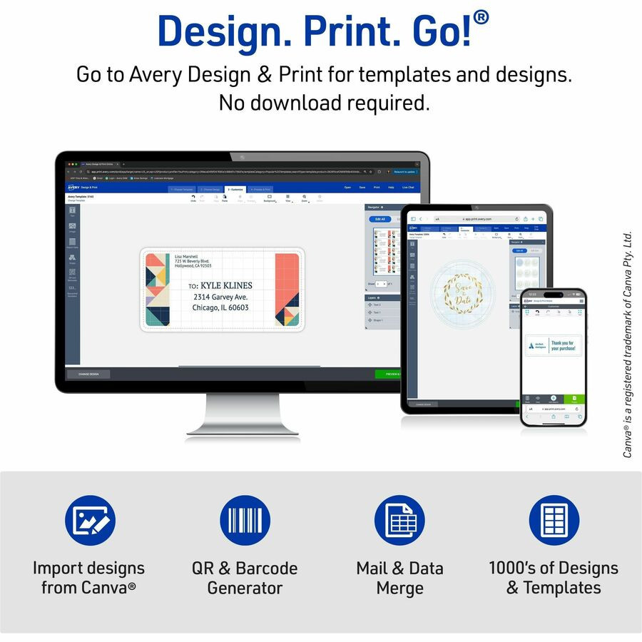 Matte White 1" Round Labels offer the perfect blank canvas for your designs. Labels allow your colorful graphics and messaging to stand out with a polished and professional finish. Sure Feed technology reduces printer jams and smudging. Print-to-the-edge layout allows full-bleed designs all the way to the edge of labels. Easy Peel feature with Pop-Up Edges make label application quick and efficient. Use various online templates and design tools using Avery Design and Print Online. Customize your labels with Avery Design and Print Online and use various label templates and design tools to print custom labels on demand. Get crisp, smudge-free printing from both laser and inkjet printers. Create custom product labels, thank you favor labels, wax melt labels and more.