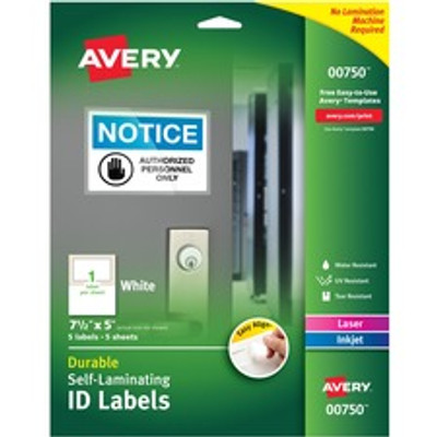 Avery® Easy Align Self-Laminating ID Labels - Waterproof - 5" Height x 7 1/2" Width - Permanent Adhesive - Rectangle - Laser, Inkjet - White - Film - Water Resistant - PVC-free, Permanent Adhesive, Self-laminating, Durable, Scuff Resistant, Te...