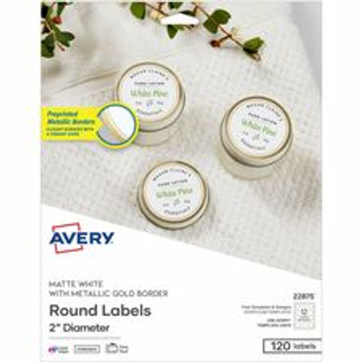 Avery® Multipurpose Label - x 2" Diameter - Permanent Adhesive - Round - Laser, Inkjet - Matte - White, Gold - Gold Border - Paper - PVC-free, Chlorine-free, Pre-printed, Easy Peel, Pop Up Edge, Tear Resistant, Strong Adhesive, Stick & Stay, C...