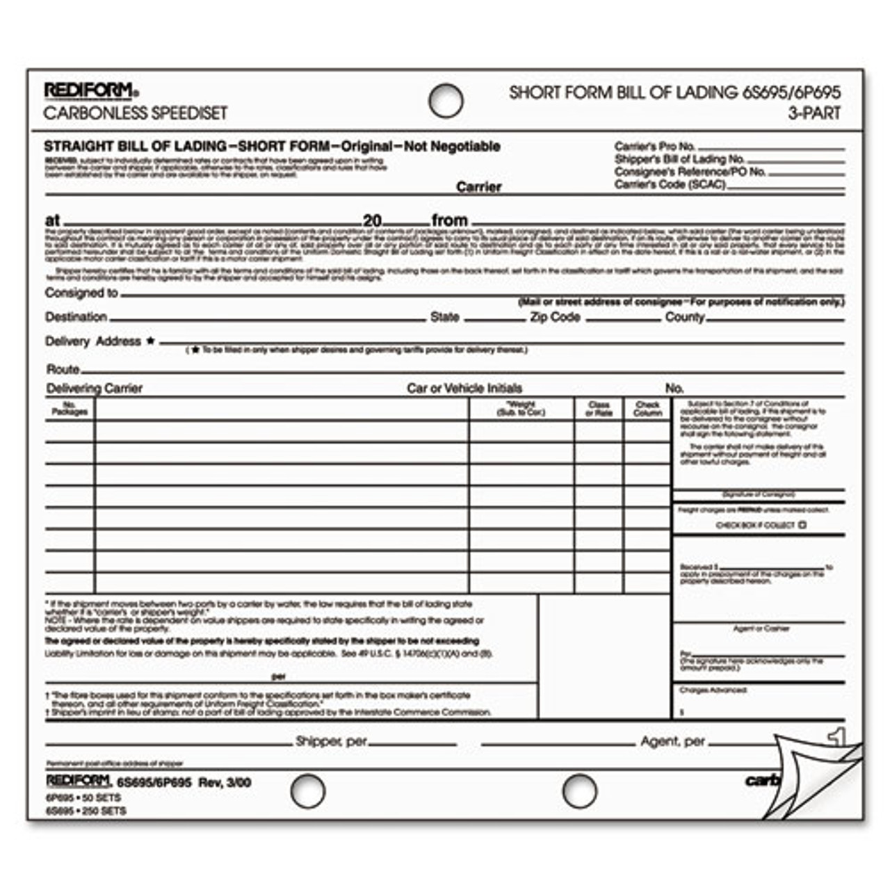 Bill Of Lading, Short Form, Three-part Carbonless, 7 X 8.5, 1/page, 50 Forms