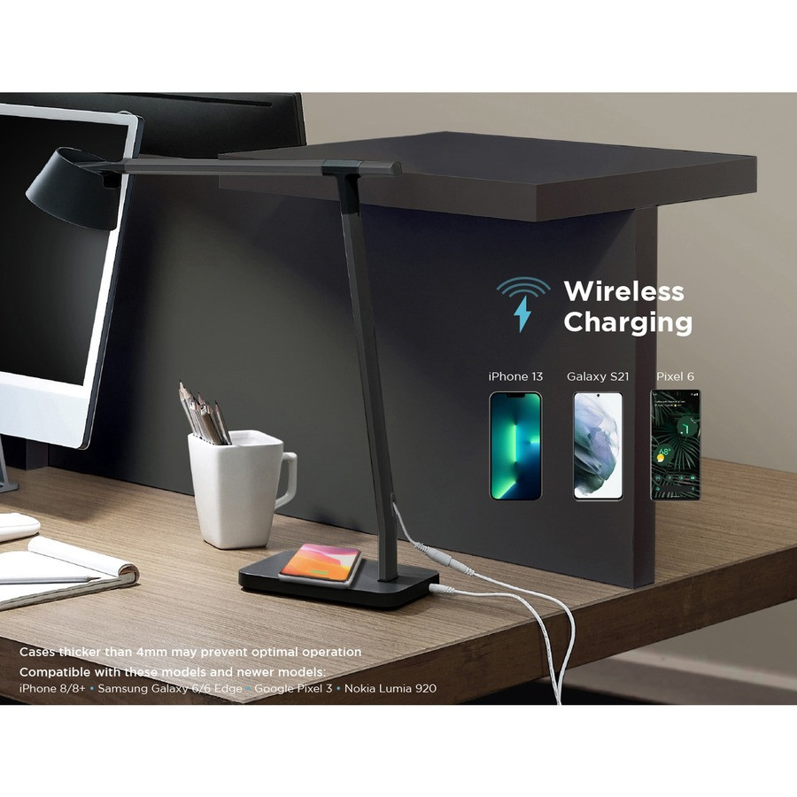 This Verve Adjustable LED Desk Lamp offers three settings for optimal lighting: warm white light, natural daylight and cool white light. It also includes a single color mode and color-changing mode with 16 million colors. Easily dim lighting with stepless dimming feature. True-Zone Circadian Rhythm Lighting mode improves sleep, focus and well-being with lighting that automatically delivers optimal color and brightness throughout the day, regulating your body's internal clock. Two other modes include sunset and chill for maximized relaxation. Easily connect lamp to your Amazon Alexa to switch between modes. Durable, forward-angled aluminum arm adds a sleek design to any space. Swivel base and lamp shade effortlessly adjust for the ultimate customized lighting. Charge your device on the wireless base for quick charging.