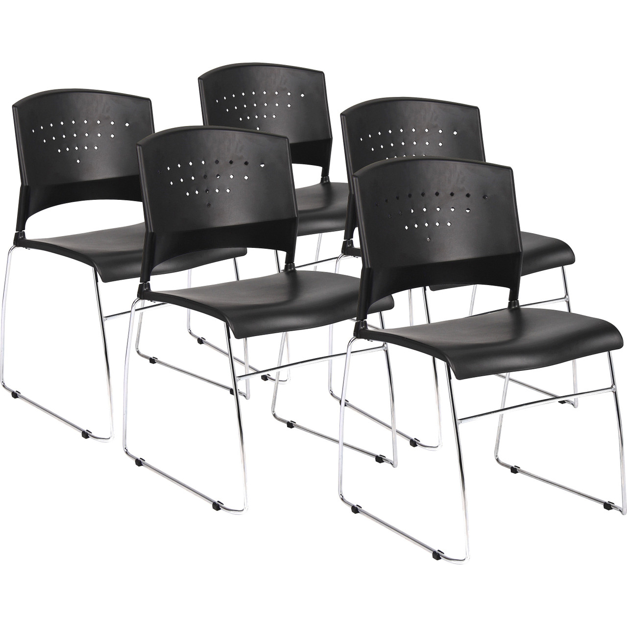 Stylish, black, Stack Chairs offer superior durability and lumbar support. Polypropylene Chairs feature solid, chrome frames and sculpted backs with an integrated opening for enhanced mobility and stacking. Stack up to 16 chairs on Boss D100 Dolly (not included) or five on the floor to save storage space. Boss Ganging Clamps (not included) are available to attach multiple units together at the bottom of the leg.