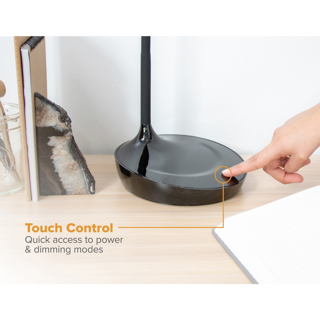 Brighten your mood and office with this Konnect Gooseneck LED Desk Lamp. It operates with a touch-sensitive power control for easy use. Adjust the brightness using the dimmer function for the perfect amount of illumination. Silicone neck is flexible to conveniently position the light where you need it. Flicker-free light zone is clear of shadows, halos and troublesome glares. Lamp features Bostitch LED technology to provide mood-boosting natural daylight, true-to-life color depiction and an eco-friendly design. Technology also increases visual acuity to reduce eyestrain. Integrated USB port charges your phone, watch or tablet and keeps your device within reach. Simple, clean aesthetic is the perfect addition to any space. Cost-efficient LEDs last up to 25,000 hours and use 85 percent less energy than incandescent lamps.