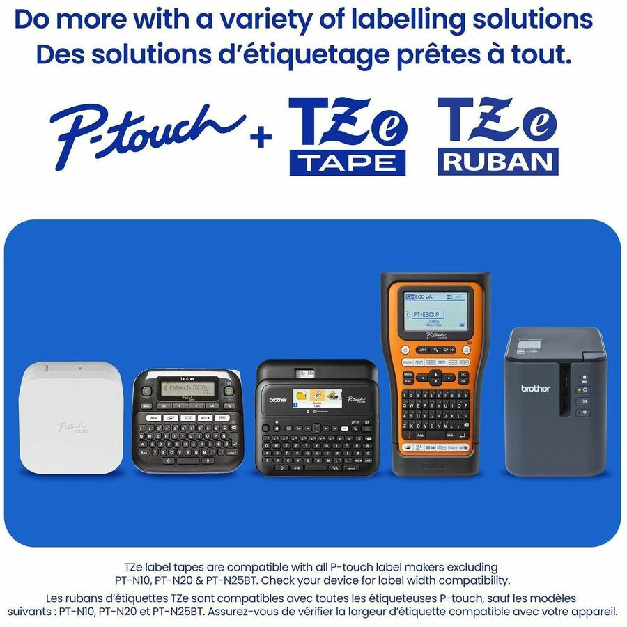 Not all labels are created equally. Engineered by Brother for use with a variety of Brother P-touch Label Makers, Brother Genuine TZe Laminated Label Tapes offer an unbeatable combination of effortless customization, long-lasting performance, and impressive strength. The patented seven-layer lamination technology provides remarkable resistance to wear and tear, and label text is printed between layers, so messaging remains. Featuring Easy Peel split backings and outstanding adhesion, they are an effective option for application on smooth, round, and textured surfaces. Tested to perform in a range of environments, these label tapes withstand temperatures from freezing to boiling. Plus, they're resistant to fading caused by sunlight and damage due to water, making them ideal for indoor and outdoor use. Chemical Resistant: TZe Laminated Label Tapes can be used on items and in areas that require frequent sanitizing with cleaners, wipes, and bleach. Restaurant kitchens, school cafeterias, tattoo shops, nursery schools, breakrooms, customer service counters. Water Resistant: TZe Laminated Label Tapes can be used in areas and on items with frequent water exposure. Hotel pool areas, backyard hot tubs, under-sink storage, laundry rooms, barber shops, fishing gear, outdoor garbage bins, dishwashers, and microwave-safe food storage. Abrasion Resistant: TZe Laminated Label Tapes can be used on items in public environments like municipal offices and government buildings or in home settings where items are often shared, accessed, or moved. Heavy storage containers, warehouse goods, power tools, dental office files, legal office binders, entry/exit doors in public buildings. Fade Resistant: TZe Laminated Label Tapes can be used in areas and on items that are exposed to sunlight. Retail store windows, flowerbeds, marinas, used car lots, swap meets, BBQ tools and accessories. Offered in multiple sizes and colors, the extensive range of TZe Laminated Label Tapes is further expanded with premium and specialty options that are perfect for more specific uses. For durable, long-lasting custom label solutions, depend on Brother TZe Laminated Label Tapes - labels that work hard to simplify the hard work of identification and organization. Images are for illustrative purposes only. Actual output (such as font and margins) may vary. Tape widths listed in inches are approximate. Actual tape widths are listed in millimeters (mm).