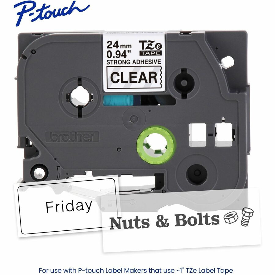 Brother Genuine P-touch TZeS151 BK on CLR Label Tape, Strong Adhesive Lam., 24mmX8m - 15/16" Width - Clear - Laminated - Water Resistant - Durable, Abrasion Resistant, Chemical Resistant, Grease Resistant, Grime Resistant, Temperature Resistant, F...