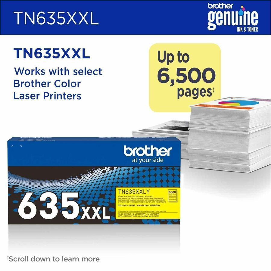 Print confidently with Brother Genuine TN635XXLY Super High Yield Yellow Toner Cartridge. Expertly engineered, Brother Genuine is the only toner brand recommended for Brother Business Color Laser Printers. With the reassurance of dependable compatibility, this cartridge produces vivid, high-quality results and delivers yields up to 6,500 pages?. A must-have for consistently impressive quality, Brother Genuine Toner is the reliable choice for producing professional documents and personal paperwork with ease. When it's time to replace your printer's toner cartridge, the Brother Genuine brand provides a worry-free experience. For best results, use with Brother single-function and all-in-one business color laser printers: HL-L8430CDW, HL-L8430CDWT, HL-L8570CDW, MFC-L8930CDW, MFC-L8970CDW, and MFC-EX575. Main Features Superior quality on every page.With reliable, consistent performance, Brother Genuine Toner produces high-quality output with vivid tones that won't fade or smudge.Confident compatibility.The only toner brand recommended for Brother single-function and all-in-one business color laser printers. This super high yield toner cartridge delivers page yields up to 6,500 pages?.Low total cost of ownership.Brother Genuine Super High Yield Toner is a cost-effective solution for businesses with high print volumes.Committed to the environment.Brother's toner cartridge collection and recycling program encourages consumers to return used cartridges to Brother free of charge, so they can be properly recycled and kept out of landfills. Plus, this toner cartridge ships in EPS-free packaging to help reduce plastic waste. For more details, visit www.brother-usa.com/environmental-programs.Developed for Brother printers.Use with Brother single-function and all-in-one business color laser printers: HL-L8430CDW, HL-L8430CDWT, HL-L8570CDW, MFC-L8930CDW, MFC-L8970CDW, and MFC-EX575.Brother products work best with Brother Genuine Toner.We strongly recommend using Brother Genuine Toner with your Brother printer. Using non-Genuine toner could cause damage to your printer. The printer's limited warranty may not cover damage resulting from the use of non-Brother supplies.
