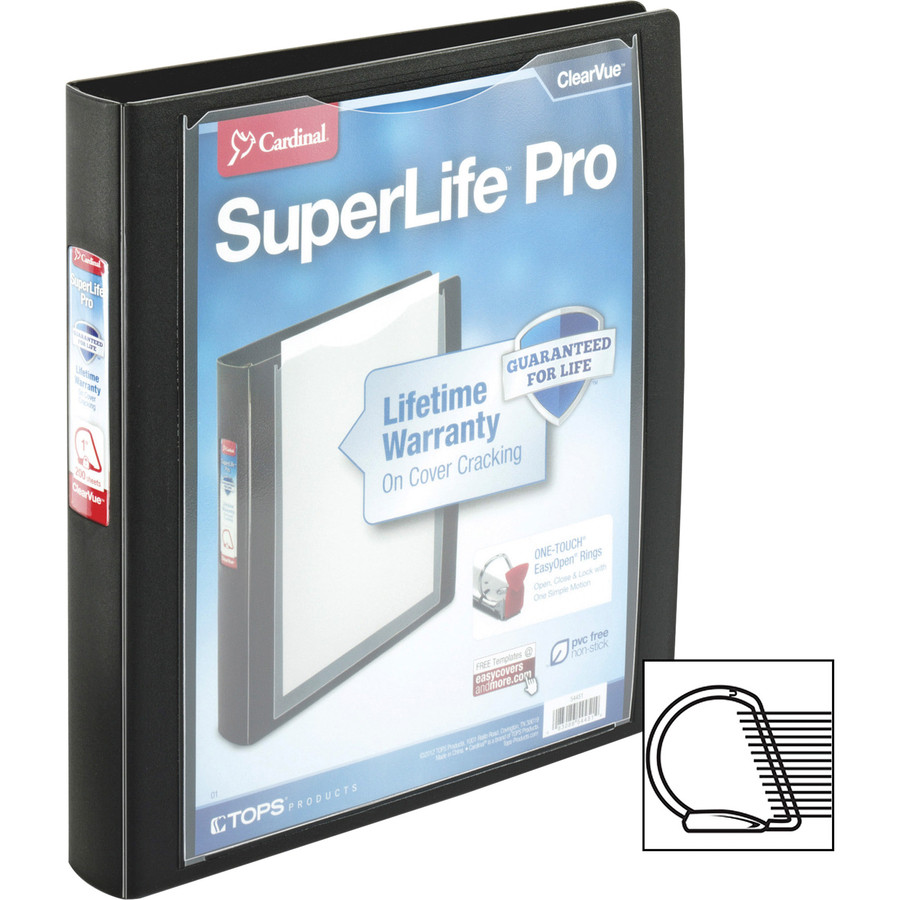 Durable D-ring binder offers heavy-duty, hard poly construction and a cover that resists cracking. Clear overlay on front cover allows easy customization. Polypropylene is nonstick. One-Touch, EasyOpen rings open, close and lock with one simple motion. Slant-D steel rings are back-mounted so pages lie flat for easy reading and marking. 1-1/2" capacity holds approximately 350 sheets. Two interior clear pockets on the front and back covers hold loose documents, and each offers a 20-sheet capacity. The pockets are made from clear, nonstick poly so the contents can be seen easily. SuperLife ProView Ring Binder includes a label holder on the spine and exposed rivets.