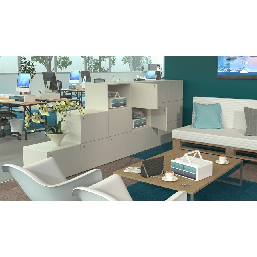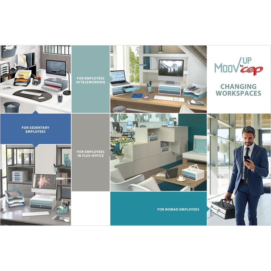 MoovUp Secure Three-Drawer Module with lock and handles offers an agile response to changing working methods. Use the three locking drawers for storing office supplies (pens, calculator and more), computer accessories (external hard drive, USB key, mouse and more), documents up to 9-2/5" x 12-1/2" , a tablet and laptop up to 14". Usable capacity on the large drawer measures 12-9/10" x 9-3/5" x 1-1/2". Half drawers hold 6-3/10" x 9-3/5" x 1-1/2". Stopper at the end of the stroke means perfect sliding. Polystyrene module is ultra-robust to serve as a screen support with an 11 lb. capacity and promote good posture. Lock secures all drawers, and a port allows the installation of an anti-theft security cable. Versatile, two sturdy handles deploy to transport it. Module stacks with stability using four integrated reliefs and notches.