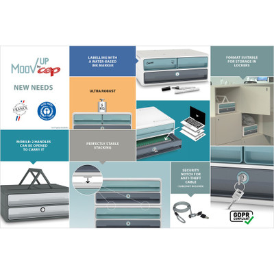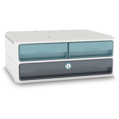 MoovUp Secure Three-Drawer Module with lock and handles offers an agile response to changing working methods. Use the three locking drawers for storing office supplies (pens, calculator and more), computer accessories (external hard drive, USB key, mouse and more), documents up to 9-2/5" x 12-1/2" , a tablet and laptop up to 14". Usable capacity on the large drawer measures 12-9/10" x 9-3/5" x 1-1/2". Half drawers hold 6-3/10" x 9-3/5" x 1-1/2". Stopper at the end of the stroke means perfect sliding. Polystyrene module is ultra-robust to serve as a screen support with an 11 lb. capacity and promote good posture. Lock secures all drawers, and a port allows the installation of an anti-theft security cable. Versatile, two sturdy handles deploy to transport it. Module stacks with stability using four integrated reliefs and notches.