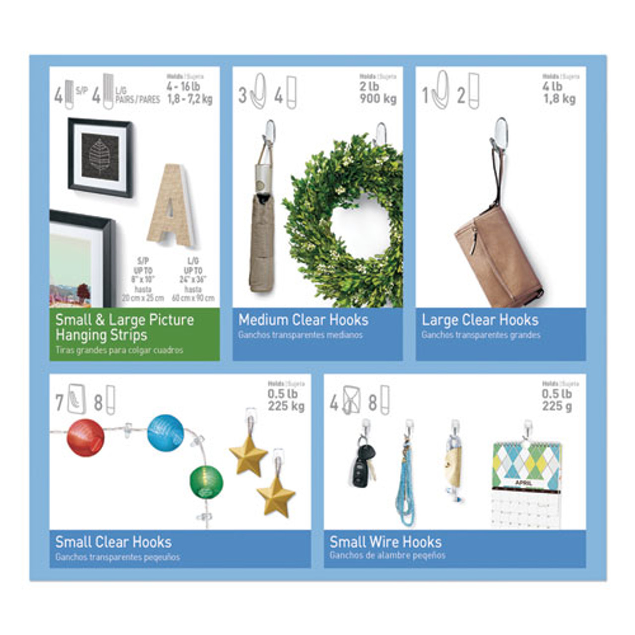 | Special Features: | Clear Hooks and Strips Variety Pack-Hang up to 19 items. Includes 8 small picture hanging strips, 8 large picture hanging strips, 3 medium clear hooks with 4 strips, 1 large clear hook with 2 strips, 7 small clear hooks with 8 strips and 4 small wire |