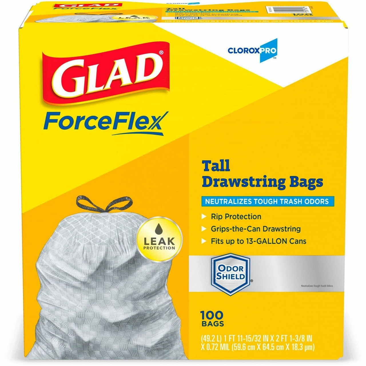 Prevent the spread of odor-causing bacteria with Glad CloroxPro. These OdorShield bags provide lasting freshness as it continuously neutralizes nasty kitchen odors. The ForceFlex technology delivers extra toughness as it flexes and expands around sharp edges and heavy loads without ripping. Featuring RipGuard and LeakGuard technology, these trash bags guard against punctures and tears, and traps liquids in the bag so you can put your most demanding trash up for the challenge. Let the stretchable strength of Glad handle all the messes a busy daily life can throw at it and then some. The Grips-The-Can Drawstring ensures that the bag stays in place until you are ready to take it out. The 13-gallon size is perfect for the kitchen or throughout the office and is great for your seasonal cleaning needs like Spring Cleaning and Back to School. Packaging may vary.