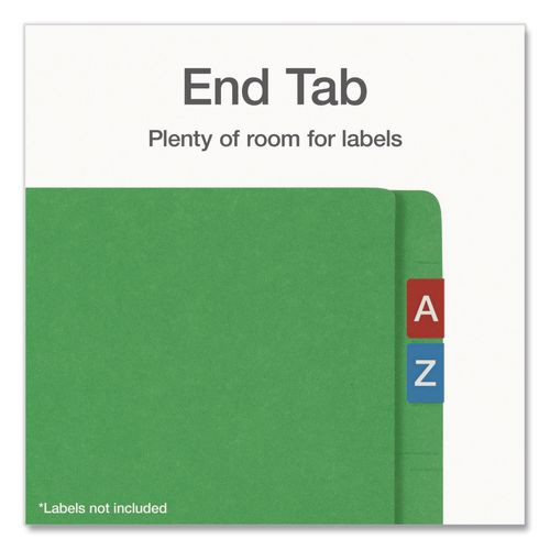 Bring color-coding efficiency to your shelf files! 2" capacity fastener in front and back interior covers organize documents. Bottom scored for 3/4" expansion. Standard 9 1/2" high front. Double-ply reinforced tabs. 11 pt. stock. Folder Size: Legal; Total Number of Fasteners: 2; Cover Tab Style: End Tab; Cover Tab Cut: Straight.