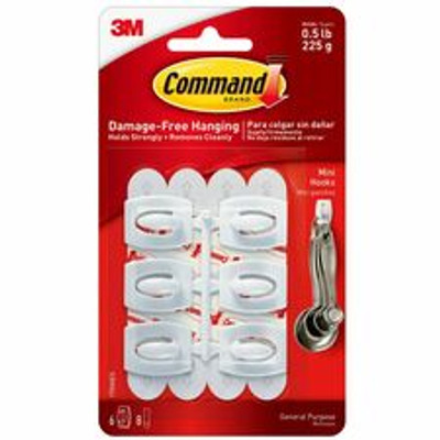 Command Mini White Hooks with White Strips - 6 Small Hook - 8 oz (226.8 g) Capacity - Plastic - White - 6 / Pack
