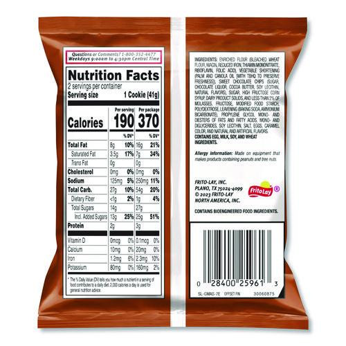 Keep a box of cookies at home or in the office and delight your visitors with a sweet snack. Anywhere you go, these cookies will satisfy your sweet tooth. Ideal for vending machines, snack bars, cafeterias and other high-volume areas. Ready-to-eat. Food Type: Cookies; Flavor: Chocolate Chip; Capacity (Weight): 2.5 oz; Sugar Free: No.