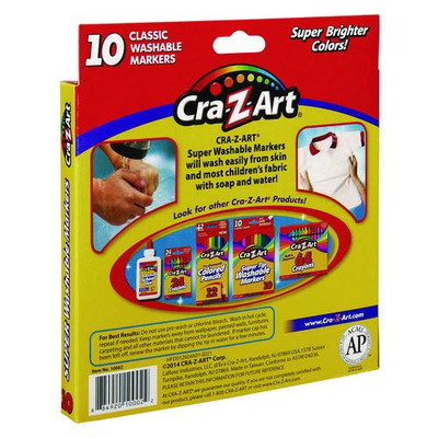 Add To Quote Cra-Z-Art® Super Washable Markers, Broad Bullet Tip, Assorted Colors, 10/set Create vivid images with a spectrum of colors. Super-bright with a finely tapered tip, they're great for covering larger areas and filling in the finer details. Special ink formula washes away easily... Add To Quote