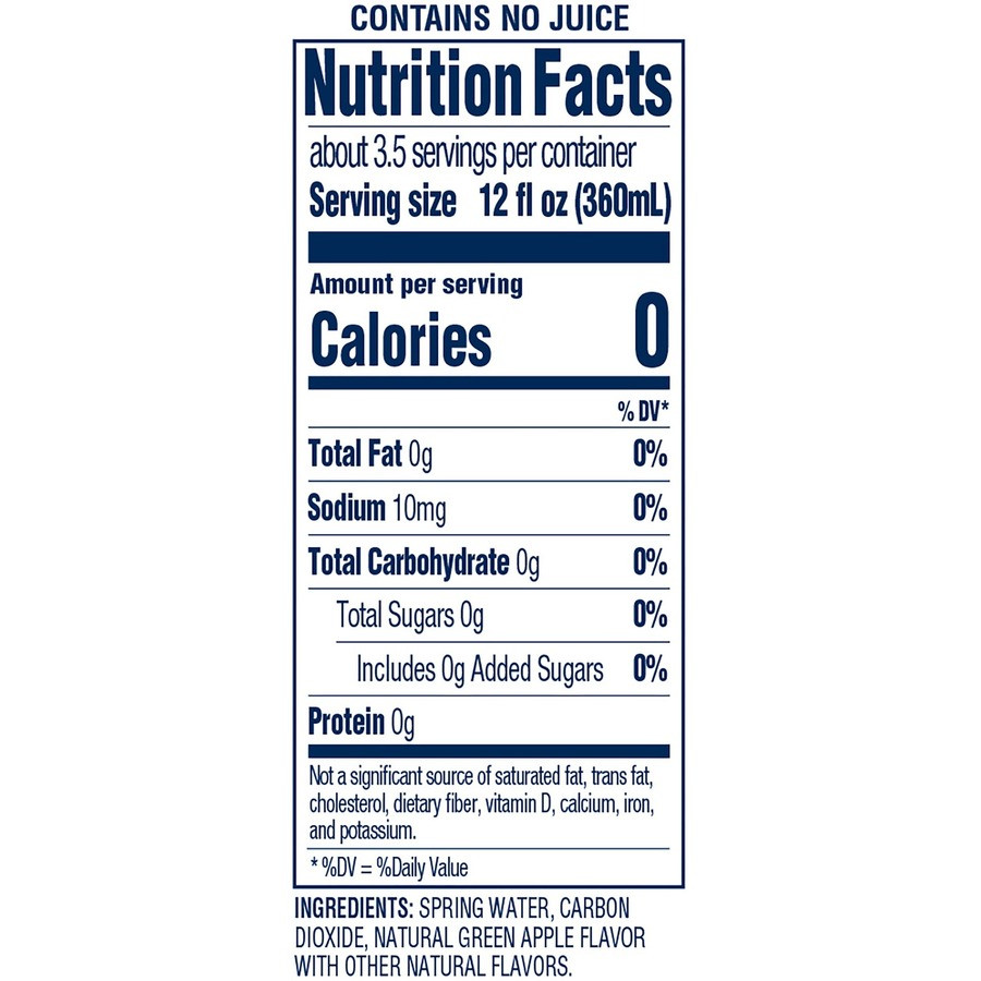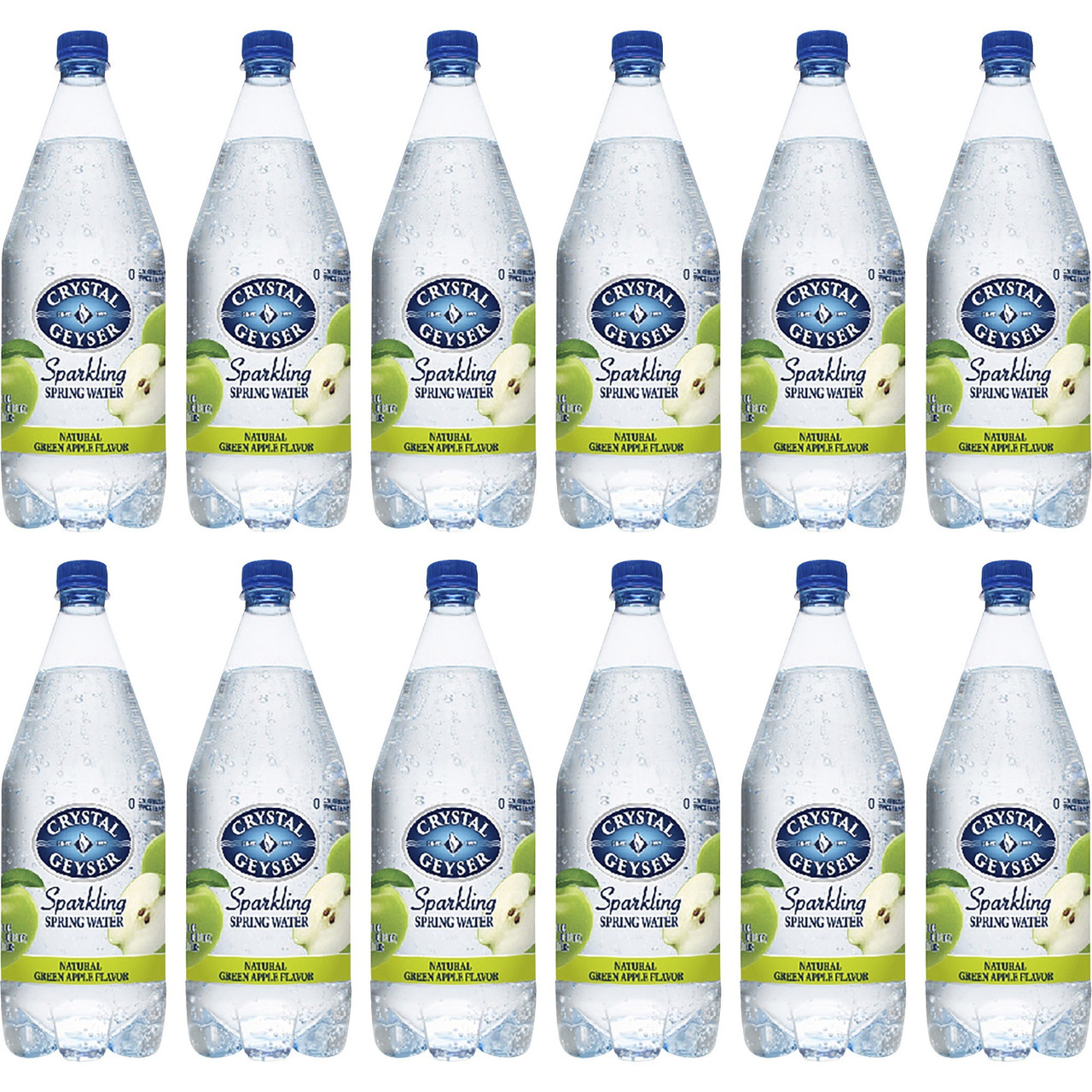 Crystal Geyser Sparkling Spring Water is made with spring water from a protected underground formation that flows to the surface of the earth unaided and may naturally contain minerals. Cold press and steam collection methods are used to capture the essence of fruits into the sparkling water. Green Apple flavor provides the crisp, tart flavor of apples. Sparkling water contains no artificial ingredients, additives or preservatives. It is calorie-free, very low in sodium and certified kosher.