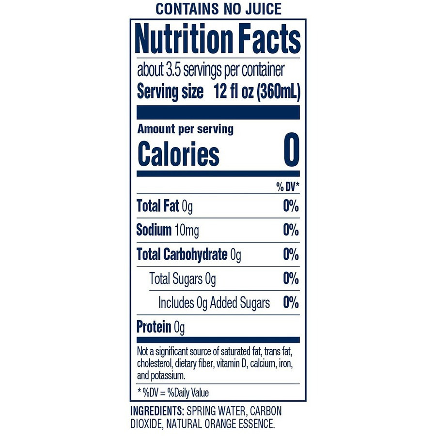 Crystal Geyser Sparkling Spring Water is made with spring water from a protected underground formation that flows to the surface of the earth unaided and may naturally contain minerals. Cold press and steam collection methods are used to capture the essence of fruits into the sparkling water. It takes Seville, Navel, Mandarin and Valencia oranges to achieve this perfectly balanced Orange flavor. Sparkling water contains no artificial ingredients, additives or preservatives. It is calorie-free, very low in sodium and certified kosher.