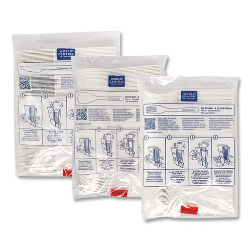 • Designed to work with World Centric® Touchless Cutlery dispenser (DPBAFKS) and sleeves (FOPS6DP, KNPS6DP, SPPS6DP).