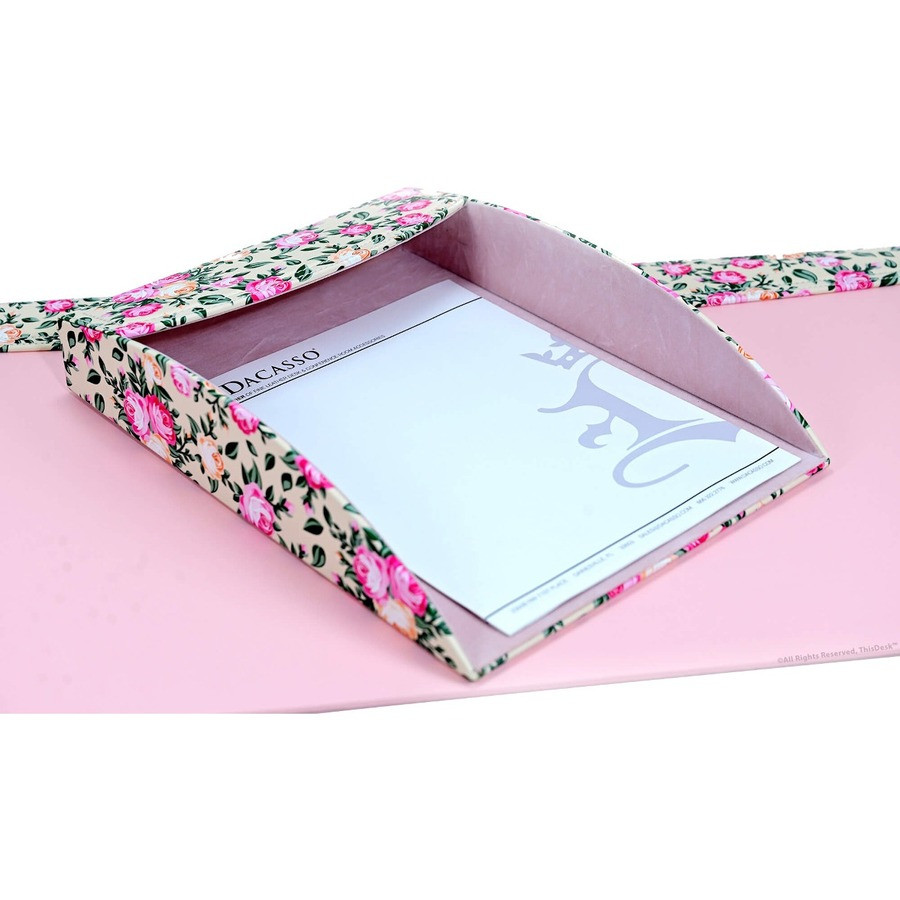 Five-Piece Desk Set features a floral design to bring an aesthetic appeal to your home or office. PU leather provides a professional look in a cost-efficient design. Soft velveteen protects surfaces from scuffs and scratches. Desk set includes a desk pad, hinged supply box, pencil cup, sticky note holder and letter-size tray.