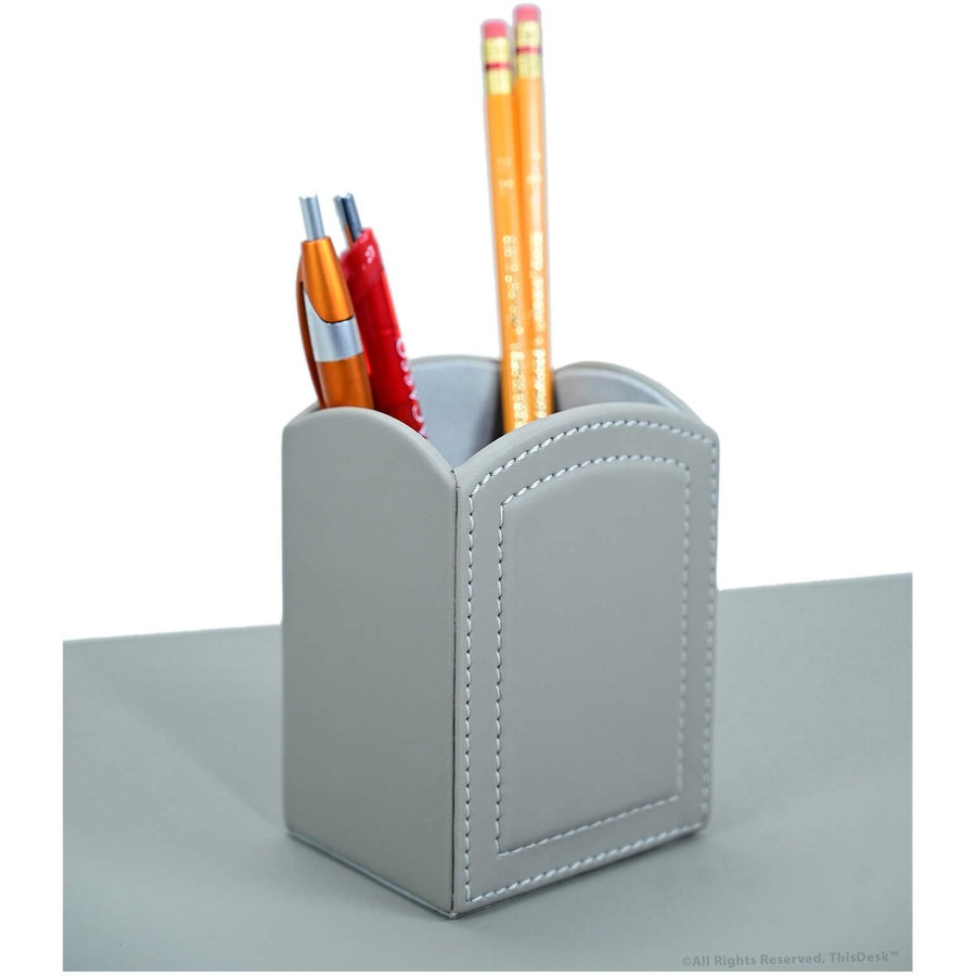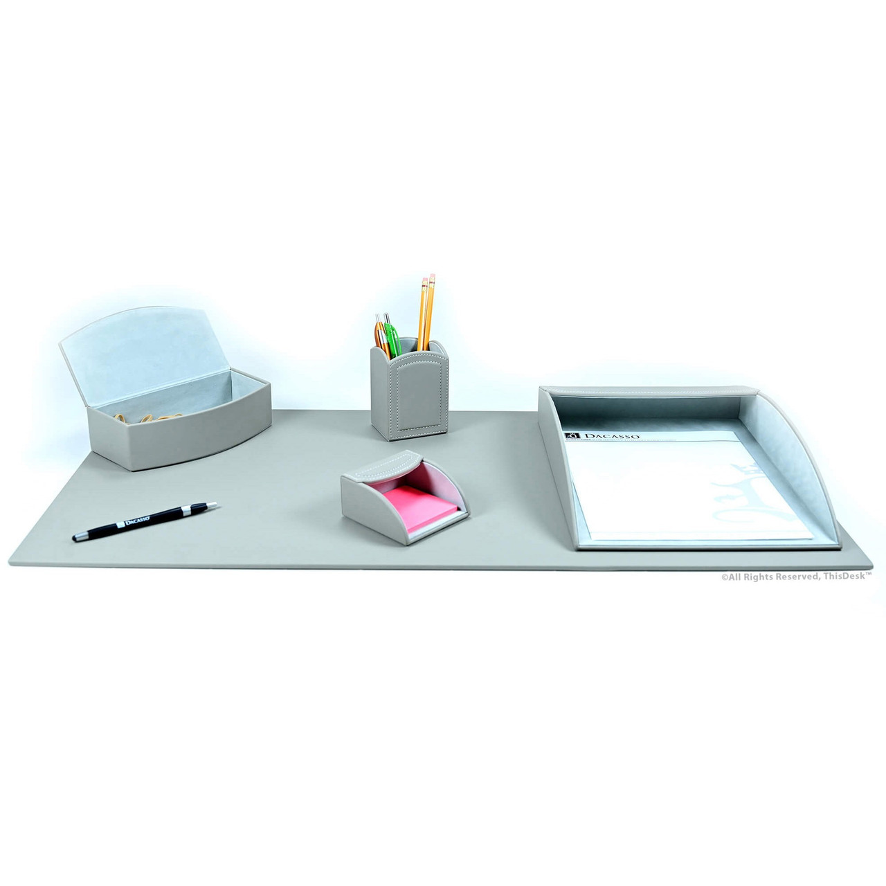 Five-Piece Desk Accessory Set brings organization and a touch of visual charm to your home or office. PU leather provides a professional look in a cost-efficient design. Soft velveteen protects surfaces from scuffs and scratches. Desk set includes a desk pad, hinged supply box, pencil cup, sticky note holder and letter-size tray.