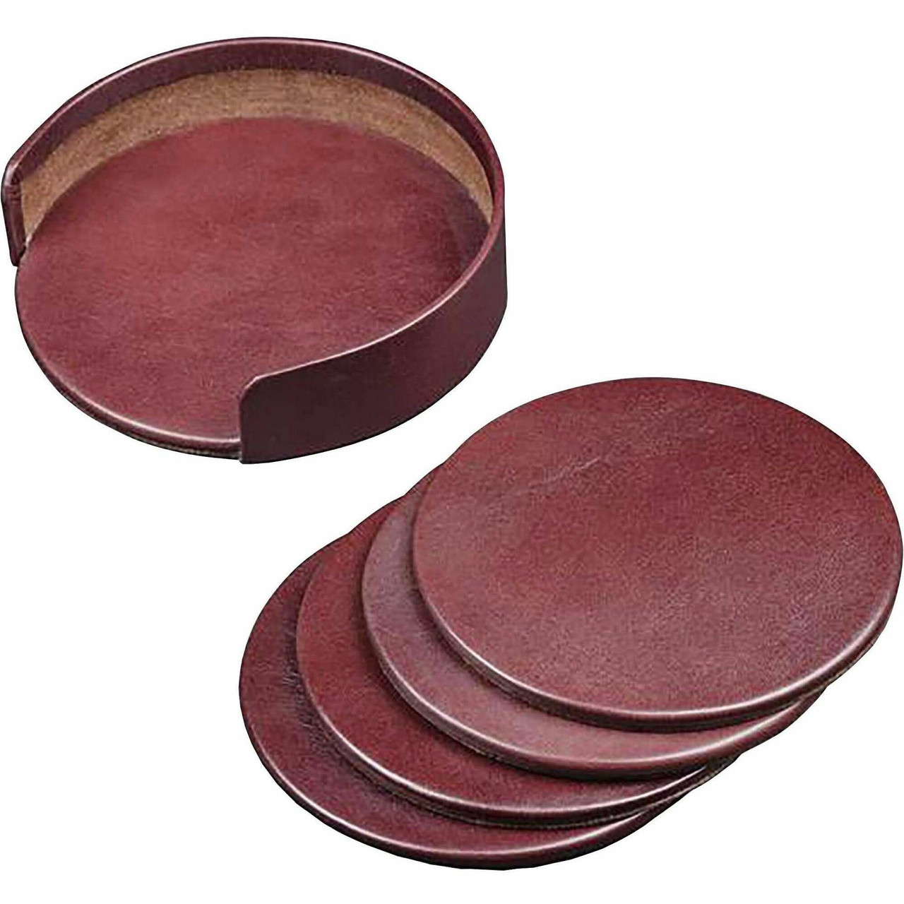 Classic Mocha Leather Round Coaster Set features a holder with an open front to keep the 4" coasters together when they're not in use. Top-grain leather adds professional style to any work space. The bottom is lined with soft velveteen to protect surfaces from scuffs and scratches. Wrapped-edge design offers greater durability for lasting use.