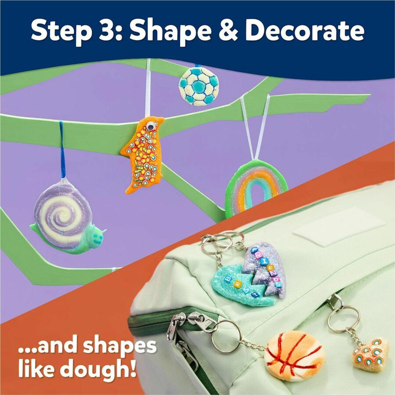 Enjoy three ways to play with the Keychain and Ornament Stretch 'N Create Dough Kit. First, explore your maker-side by mixing your own creation that stretches like slime and shapes like dough. When it's ready, enjoy poking, squishing and pulling your stick-resistant dough to the highest limits. After 10 to 20 minutes of action-packed play, the dough starts to harden. Shape your dough and use the glue pens and special decorations from the all-inclusive kit to create keychain and ornament masterpieces. Keep the fun going with this hands-on arts and craft activity by finding a special place for them or gifting them to a friend. 18-piece kit includes two Clear Glue bottles, two Magical Liquid bottles, two Magic Powder packs, six glue pens, one bag of ribbons, one bag of keychain Rings, three bags of decorations, one bag of assorted decorations and instructions.