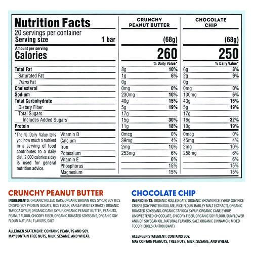 | Package Includes: | (10) Each: Chocolate Chip, Crunchy Peanut Butter |