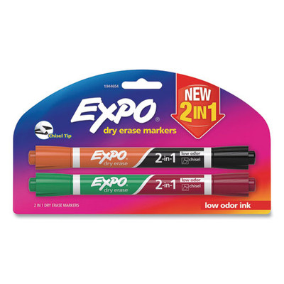 Add To Quote EXPO® 2-in-1 Dry Erase Markers, Medium Chisel Tip, Assorted Colors, 2/pack Two chisel tip colors in one dry erase marker. Use EXPO® colors to track, schedule and present. Low-odor ink. For use on whiteboards, glass and most non-porous surfaces. Add To Quote