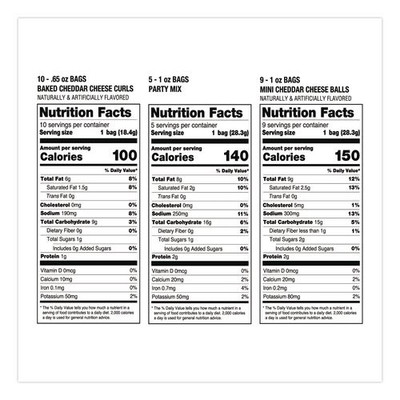 | Package Includes: | (10) 0.65 oz Baked Cheddar Cheese Curls; (9) 1 oz Mini Cheddar Cheese Balls; (5) 1 oz Honey Barbeque Potato Chips; (5) 1 oz Party Mix; (5) 1 oz Salt & Vinegar Potato Chips; (4) 1 oz Red Hot Potato Chips; (4) 1 oz Zapp's Voodoo Potato Chips |