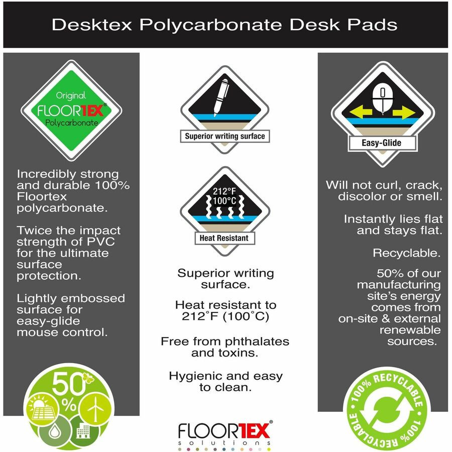 Desktex polycarbonate desk mat provides incredibly durable, clear desk protection and is heat-resistant to 212 degrees Fahrenheit to protect desktops from hot drinks. It offers twice the impact strength of vinyl. Extremely durable mat reliably protects desks from scratches, scuffs and spillage. It is compatible with optical and ball-operated mouse units. Mat is 100 percent recyclable and manufactured using up to 25 percent renewable energy.