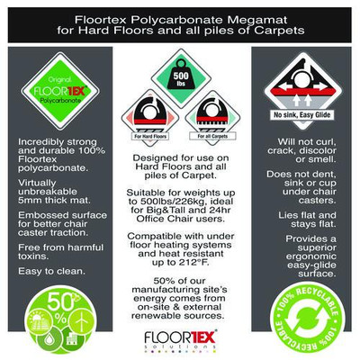 Add To Quote Floortex® Cleartex Megamat Heavy-duty Polycarbonate Mat For Hard Floor/all Carpet, 46 X 53, Clear The ultimate chair mat for the heavier user. Tested to 500 lbs. Ideal for use with Big & Tall and 24 hour chairs. Extremely durable polycarbonate will not crack, curl, cup, discolor or smell and is... Add To Quote