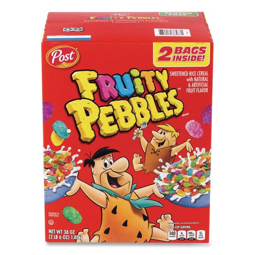 Get a jump start on your busy schedule by pouring a bowl of delicious Fruity Pebbles™ Cereal. Since 1971, Flinstones-inspired PEBBLES cereal has been capturing the hearts of all age groups and bringing joy to breakfast-time. This sweetened crisped rice cereal has an intense fruity flavor. The delicious taste and crunchy texture are a great way to kick-start your family's day. Fruity Pebbles™ already pack a nutritious punch, and when served with skim milk, you have boosted the vitamin and nutrient content of your breakfast. Low-carb with only 8 g of sugar per serving, 25% of your daily value of vitamin B12 and Folic Acid, and 20% daily value of vitamin D. This delicious cereal has been a family favorite for over 40 years and it is gluten-free. Start your morning off with a flavorful blast. Food Type: Cereal; Flavor: Fruity; Capacity (Weight): 38 oz; Sugar Free: No.