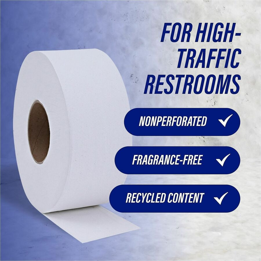 This jumbo roll of two-ply bathroom tissue satisfies everyday needs. Made from a high percentage of recycled fiber, it exceeds EPA comprehensive procurement guidelines. This bathroom tissue is cost-effective solution for all areas and is safe for sewer and septic systems. It fits in bathroom tissue dispensers that hold a 12" diameter roll.