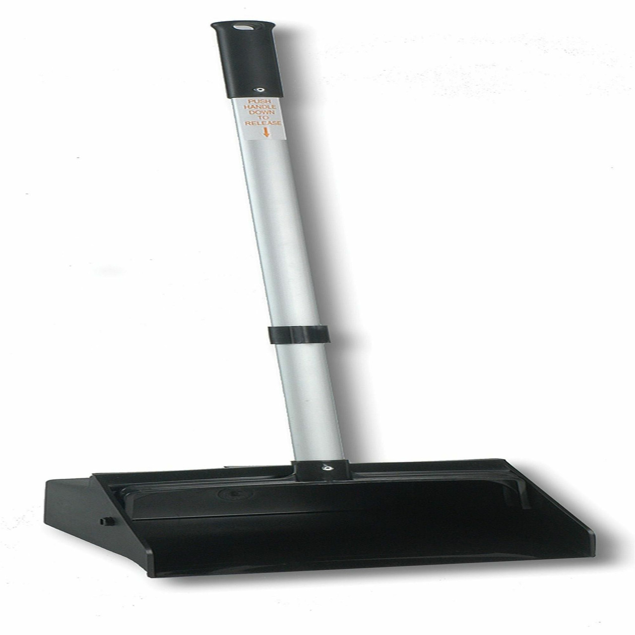 Lobby Dustpan with a straight, 30" long aluminum handle provides a simple, cost-effective solution for cleaning. Spill-proof locking handle lets you carry and hang up without spilling. Fins help clean lint and other debris from your broom (not included). 11-1/2" wide pan opening is standard size for general cleaning.