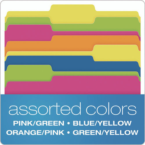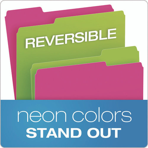 You get a total of five colors among four folders, but you have eight combinations with the reversible design. Folder colors are green/yellow, pink/green, orange/pink and blue/yellow. Turn the folders inside-out if you need to change-up the order of your system for convenience. Standard 11-point construction works best for ordinary computer paper, glossy brochures and photos. Each folder can expand to hold up to 150, 8.5" x 11" pages, which amounts to a medium-sized report. These folders work well for employee files, daily transaction records, everyday financial statements, signed documents and printed correspondence. Staggered tabs let you label each folder appropriately, including hand-writing words, letters or numbers on folders. Alternatively, go for a professional look by printing customized labels on your computer. The expandable filing system gives you complete freedom to organize your desktop, file cabinets, archival storage or employee documents.