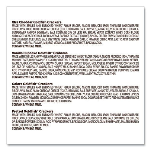 The Snack that Smiles Back when it comes to Goldfish crackers, you can feel good about serving your favorite snacks. All of our cheese varieties are baked with real cheese, and Goldfish crackers are made with no artificial preservatives or flavors. Featuring Goldfish Colors, Flavor Blasted X-tra Cheddar, Pretzel and Vanilla Cupcake pouches. Food Type: Crackers; Flavor: Colors Cheddar; Flavor Blasted Extra Cheddar; Grahams Vanilla Cupcake; Pretzel; Capacity (Weight): Assorted; Sugar Free: No.