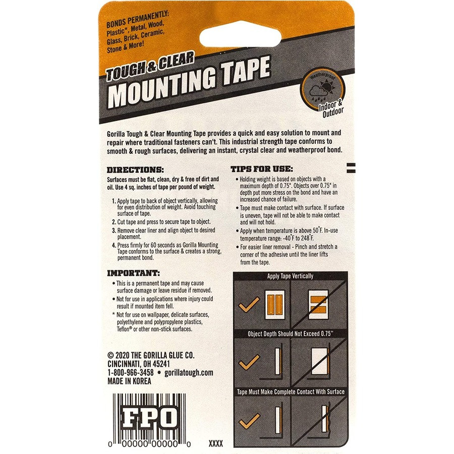 Tough and Clear Mounting Tape is a clear double-sided tape that mounts in an instant for a permanent, weatherproof bond. Crystal-clear adhesive tape won't yellow over time. This moisture-resistant mounting tape is perfect for indoor and outdoor projects and sticks to smooth and rough surfaces. Weight capacity is 1 lb. per 4" of tape depending on surface texture, porosity and flatness. Use on metal, wood, glass, brick, ceramic, stone and more. Completing DIY projects is easy with this tough, double-sided tape. Mount, build and repair.