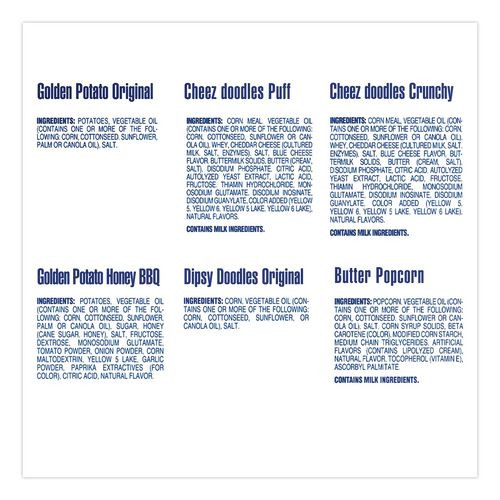 | Package Includes: | (7) 0.75 oz Honey BBQ Potato Chips; (7) 0.75 oz Original Potato Chips; (9) 0.75 oz Cheez Doodles Baked Puffs; (9) 0.85 oz Cheez Doodles Extra Crunchy; (9) 0.88 oz Dipsy Doodles Original Corn Chips; (9) 0.5 oz Popcorn |
