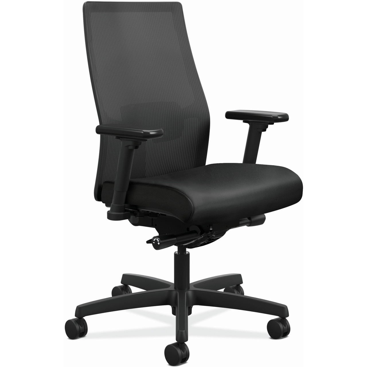 No matter who you are, how you work or where you work, Ignition seating from HON fits. Designed by Wolfgang Deisig, Ignition supports every body type, work style and office activity. Ignition Mesh Back Chair features an advanced synchro-tilt control mechanism and reclines just the way you like. Create the customizable comfort that perfectly fits you with adjustable lumbar and arms that adjust in height and width. Breathable, four-way stretch mesh back lets the air and the comfort flow freely. Tilt tension controls the rate and ease of recline. 360-degree swivel provides freedom of movement in any direction. Pneumatic seat-height adjustment moves the seat up and down to adapt to various body heights. Mid-back task chair is equipped with a five-star nylon base, hard casters for easy rolling and a black frame. Mesh back color is black. Seat is upholstered in black polyurethane. Weight capacity is 300 lb. Task chair assembles easily.