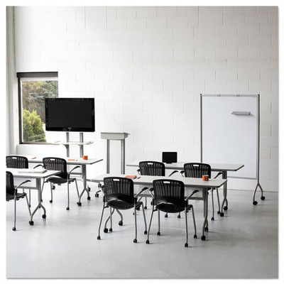 Easily define any space with this magnetic whiteboard screen. Features steel frame with four casters (two locking) for easy mobility. Magnetic accessory tray, eraser and easel pad hooks included.