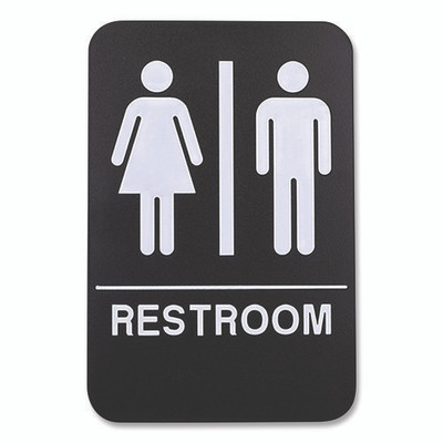 Indoor/outdoor Restroom Sign With Braille Text And Wheelchair, 6" X 9", Black Face, White Graphics, 3/pack
