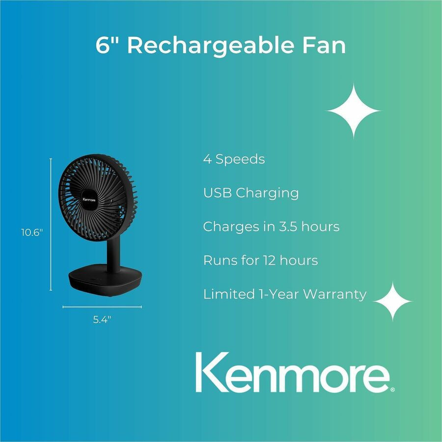 Kenmore 6" Rechargeable Fan - 4 Speed - Rechargeable, Lightweight, Quiet Operation - Black