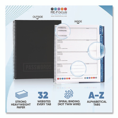 Large Password Log Book, 384 Total Entries, 4 Entries/page, Black Plastic Cover, (48) 10 X 7.5 Sheets